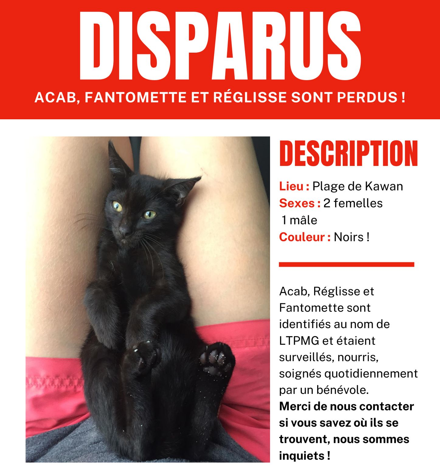 RETROUVÉS 🤩 ! LA bonne nouvelle 2021 pour bien commencer l'année, c'est que nos trois panthères noires Acab, Réglisse et Fantomette vont très très bien 🐈⬛ ! Rappelez-vous, ils étaient tous les trois sur la plage de Kawan au moment de leur disparition... 🌴 Ils avaient en réalité été ramassés par une dame amoureuse des chats qui les pensait abandonnés. Ils vont donc très bien, ont grandi et Acab et Réglisse seront stérilisés prochainement ☺. C'est pas tout ! La personne qui souhaitait adopter l'un d'entre eux.......compte toujours avoir sa panthère 🥰 Nous espérons donc bientôt en placer un dans sa nouvelle famille 🖤. @bientôt ;) !